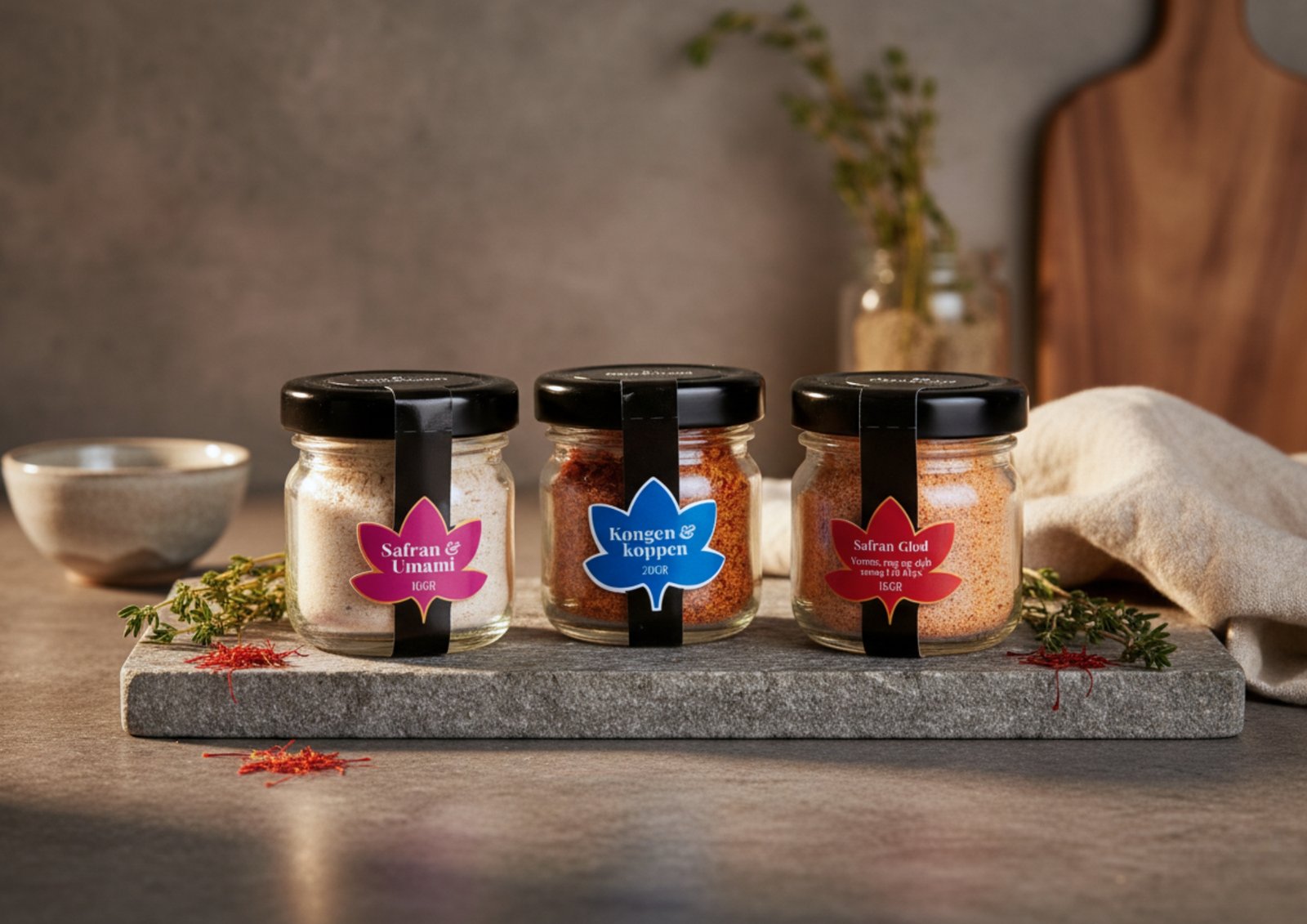 Safran er et eksklusivt krydderi, der kommer fra trådene af blomsten Crocus sativus. Det er kendt for sin rige smag, dybe gyldne farve og anvendelse i både søde og salte retter.
