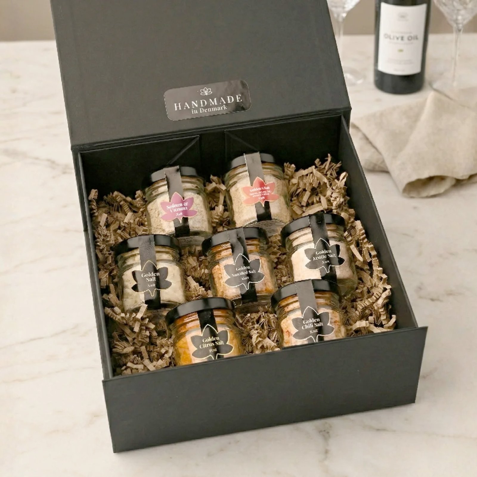 • Indholdet: Tre håndblandede glas: Safran Glød (varm røg), Safran & Umami (ren smagsforstærker) og Golden Smoked (luksus flagesalt).