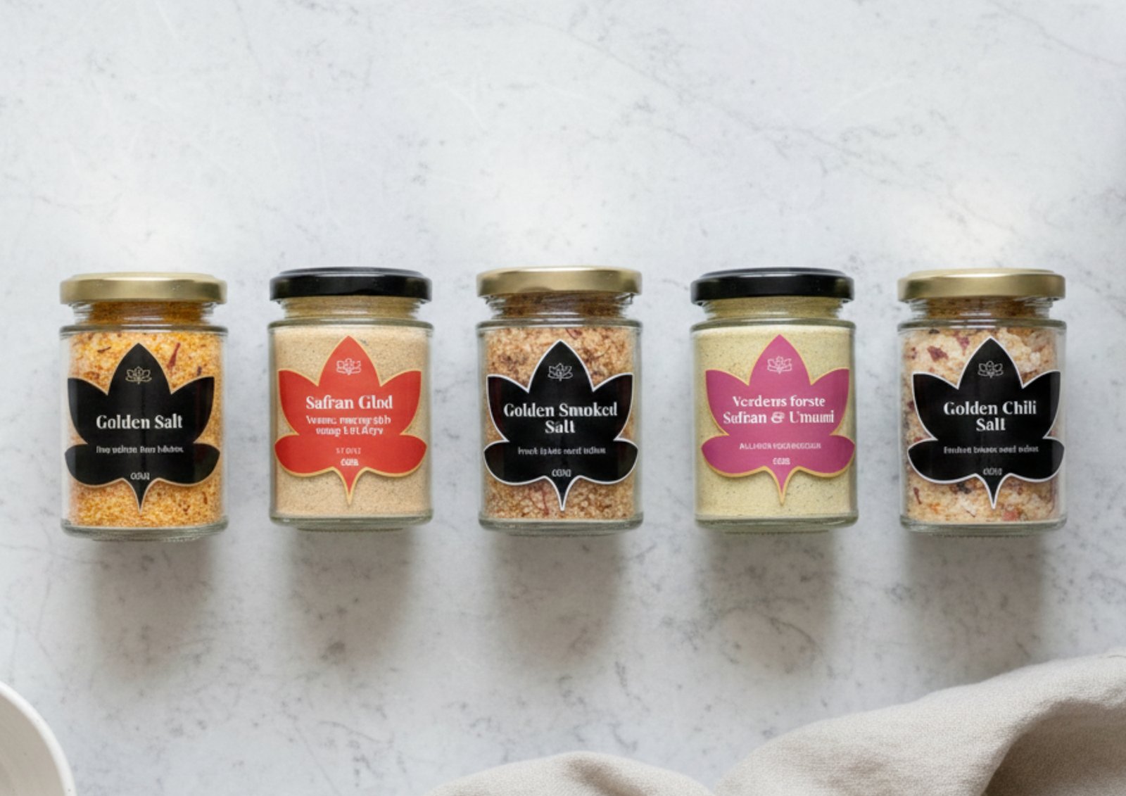 Ingredienser (Golden chili salt): flagesalt, cayannepeber, chilipulver, safran